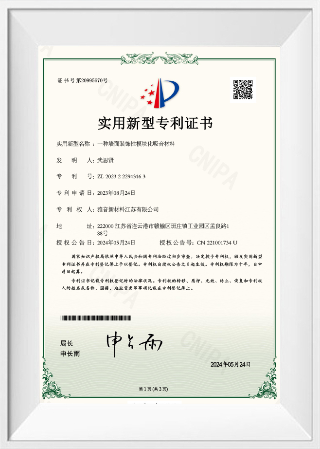 Certificat de brevet pour un matériau modulaire insonorisant pour la décoration murale